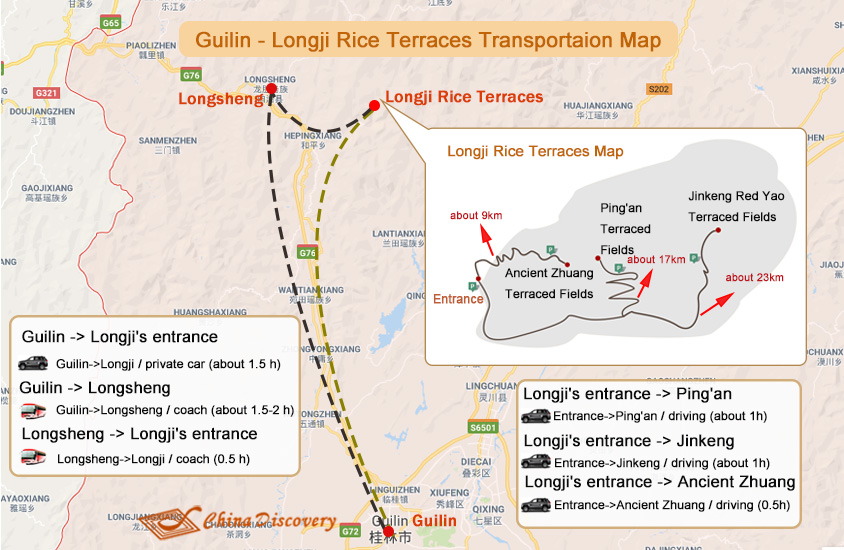 - ● Guilin - Longji Rice Terraces (distance: 98kilometers): Longji Rice Terrace is consisted of three main terraced fields - Ping’an Rice Terrace, Jinkeng Rice Terrace and Longji Ancient Zhuang Rice Terrace. At present, only Jinkeng Dazhai Rice Terrace has direct coaches traveling between Longji and Guilin. To visit Ping’an and Longji Ancient Zhuang Rice Terraces first, travelers should take coaches from Guilin to Longsheng County first and then transfer to Longji. The whole bus ride takes around 2~2.5 hours. To know more specific transportation plan between Guilin and Longji Rice Terrace, please go and check Guilin to Longsheng & Longsheng to Guilin Transportation Guide 2019.